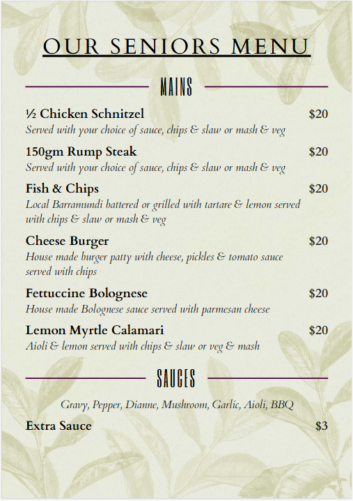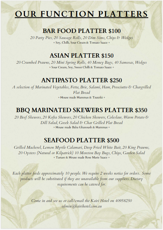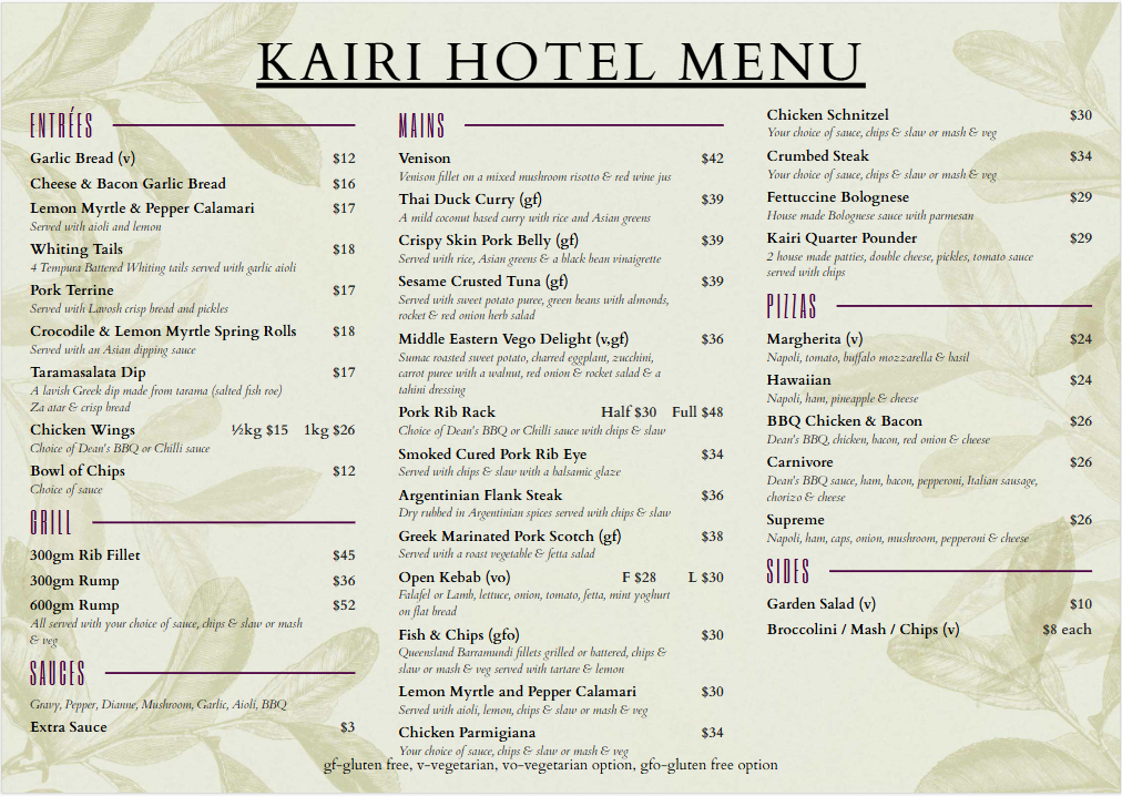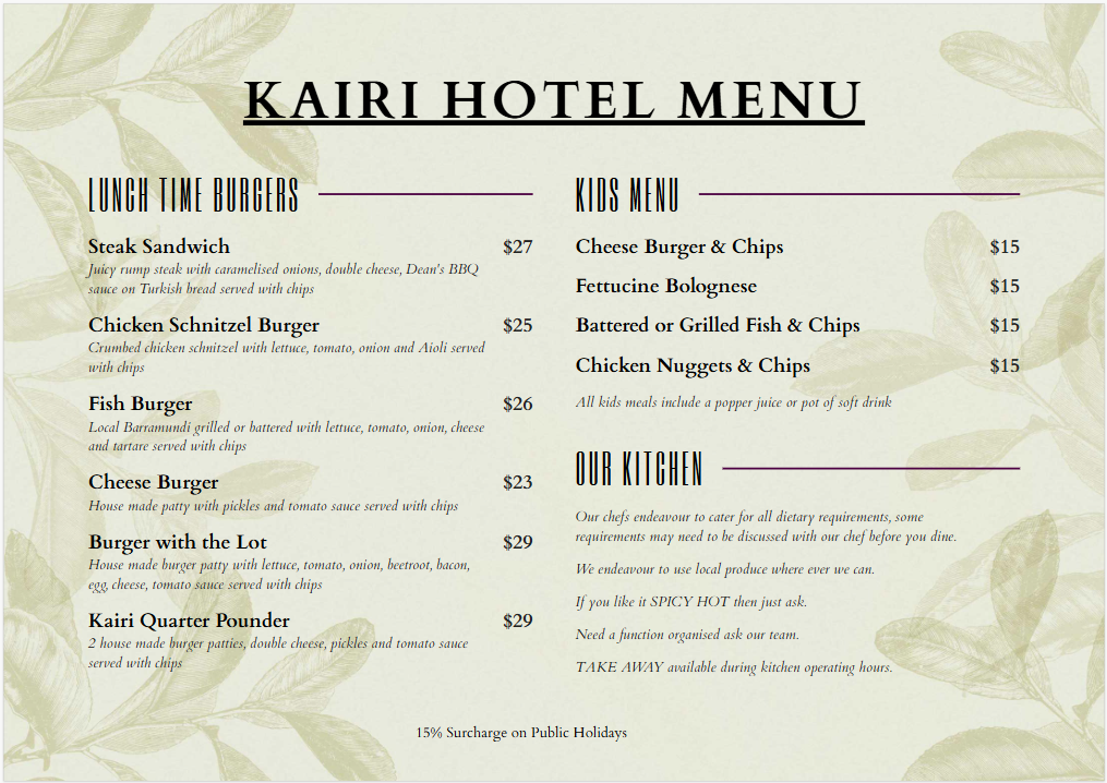 Our menu features a range of everyone’s favourite meals, using local Queensland produce. But that’s not all – our chef’s specials are crafted with love to create dishes that will delight your taste buds. Come and taste the difference at Kairi Hotel.